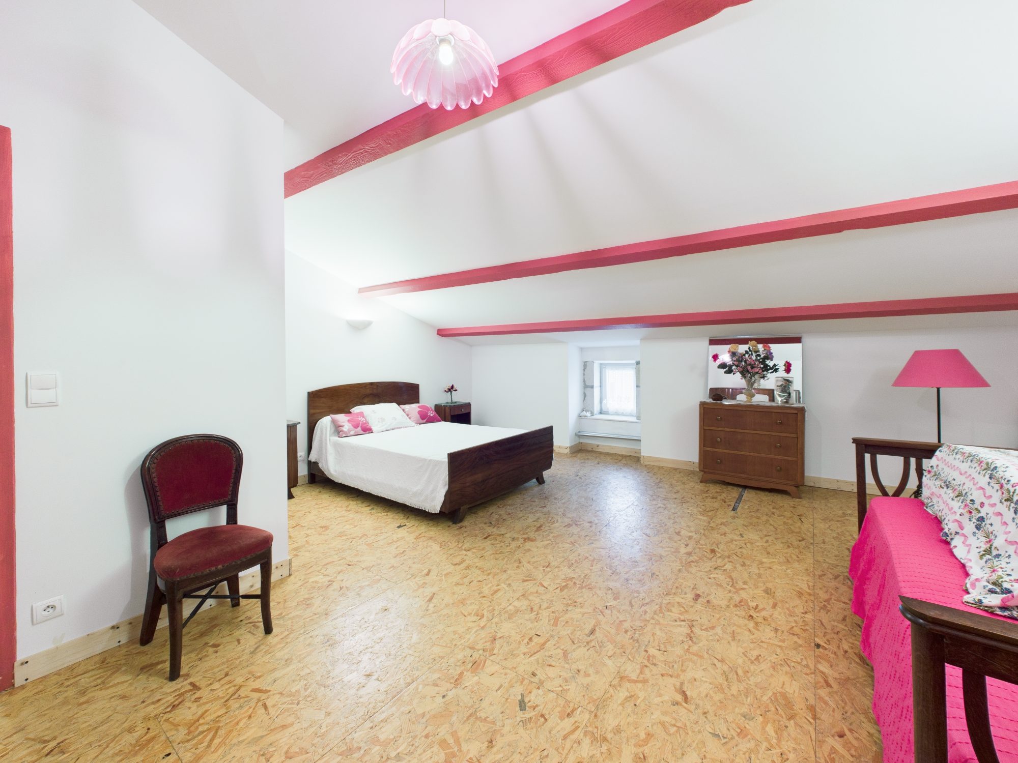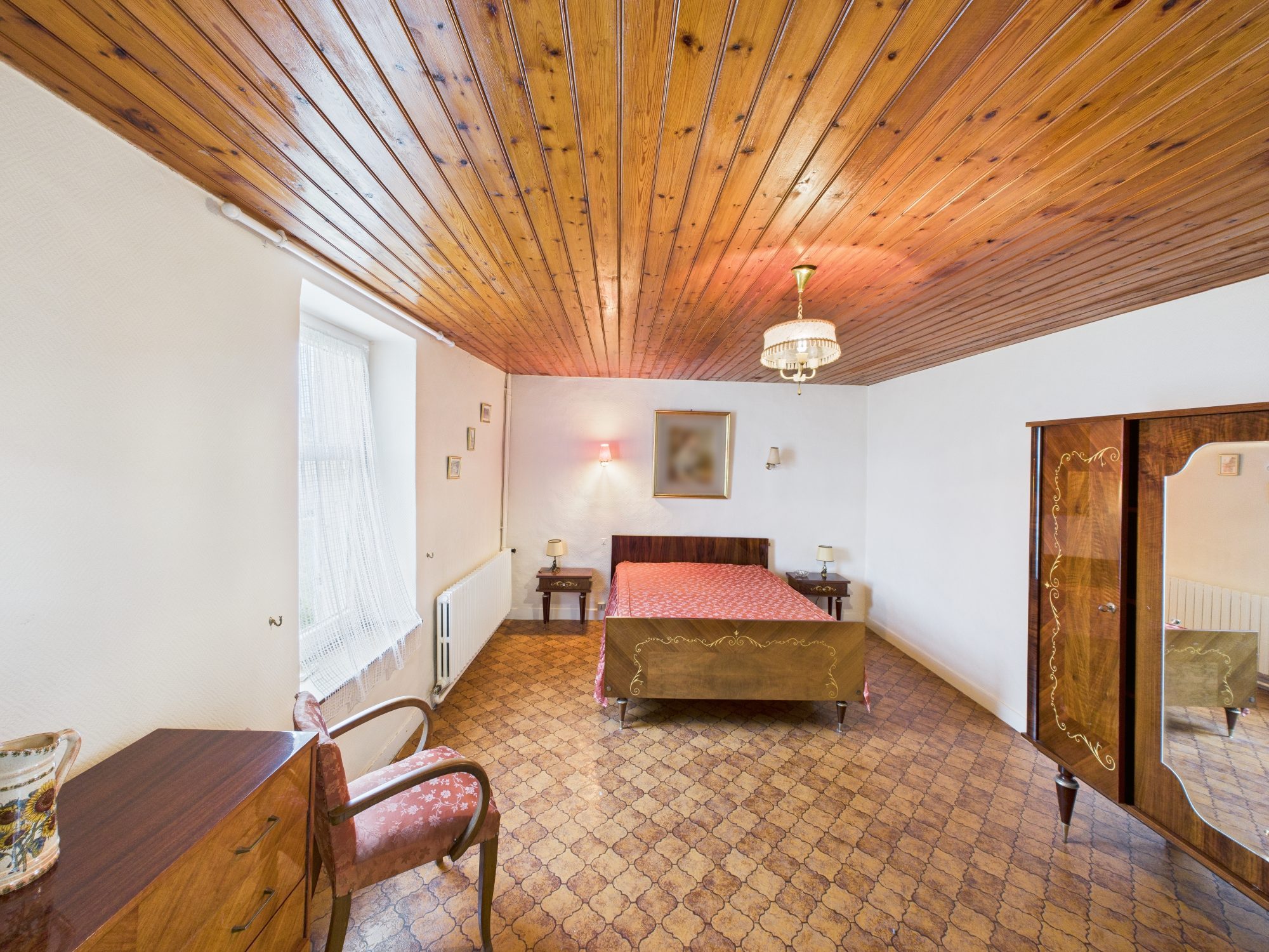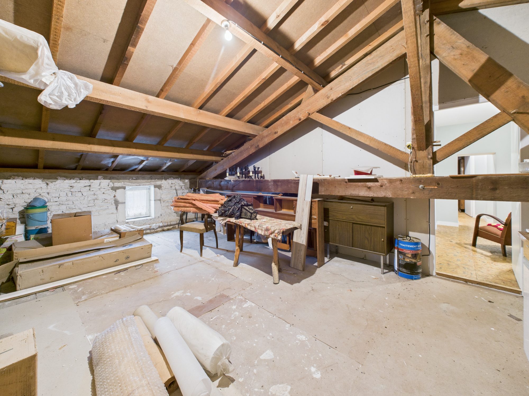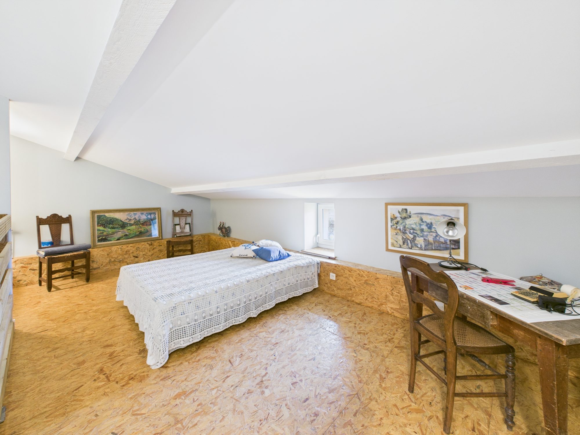 À l’étage, vaste palier servant de chambre d’appoint pouvant être aménagé en la pièce de votre choix, deux grandes chambres. Deux greniers se trouvent sur ce même étage dont un qui est prêt à accueillir une salle d’eau.