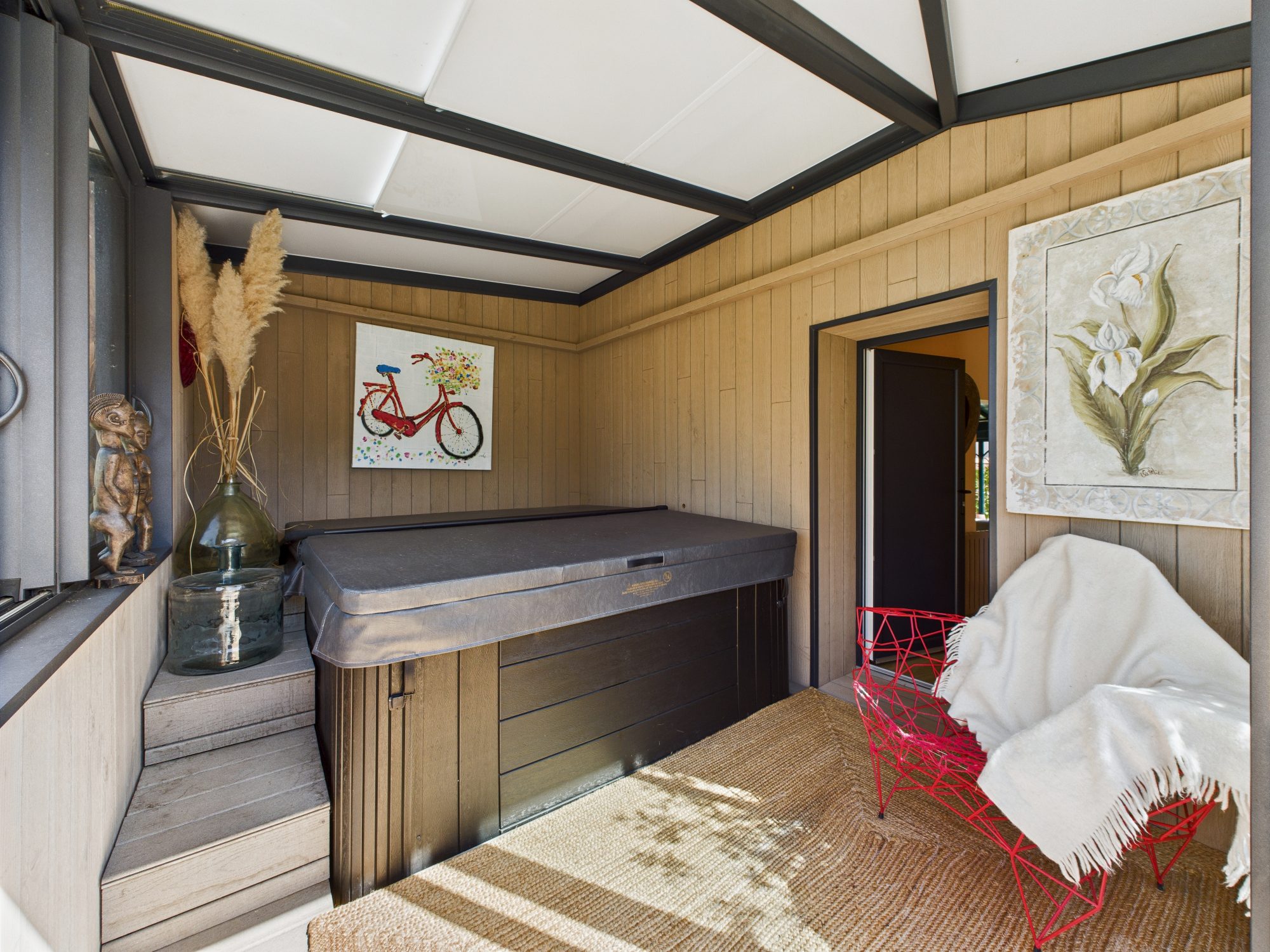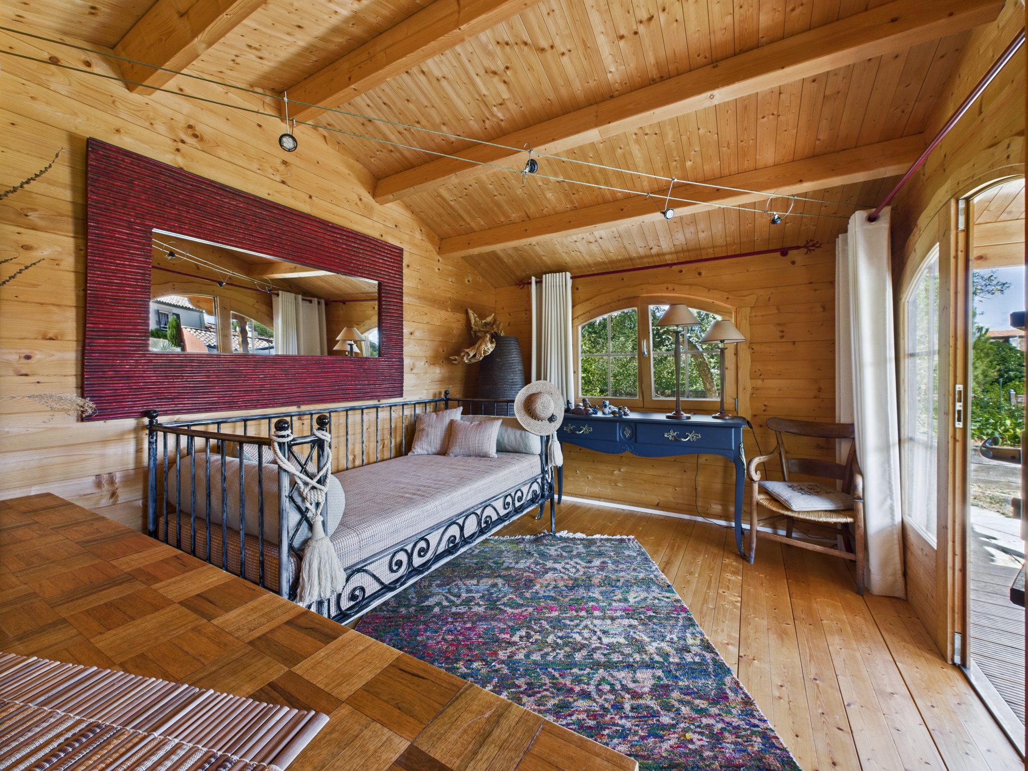 – Une maison d’invités indépendante, avec pièce principale et poêle à bois, espace sanitaire complet et espace bien-être avec spa