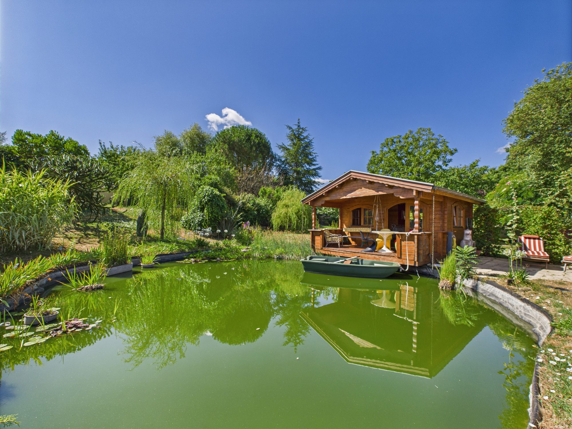 – Un chalet en bois niché en hauteur, offrant une vue panoramique sur l’étang privé et le village – un lieu magique propice à la méditation ou à la lecture